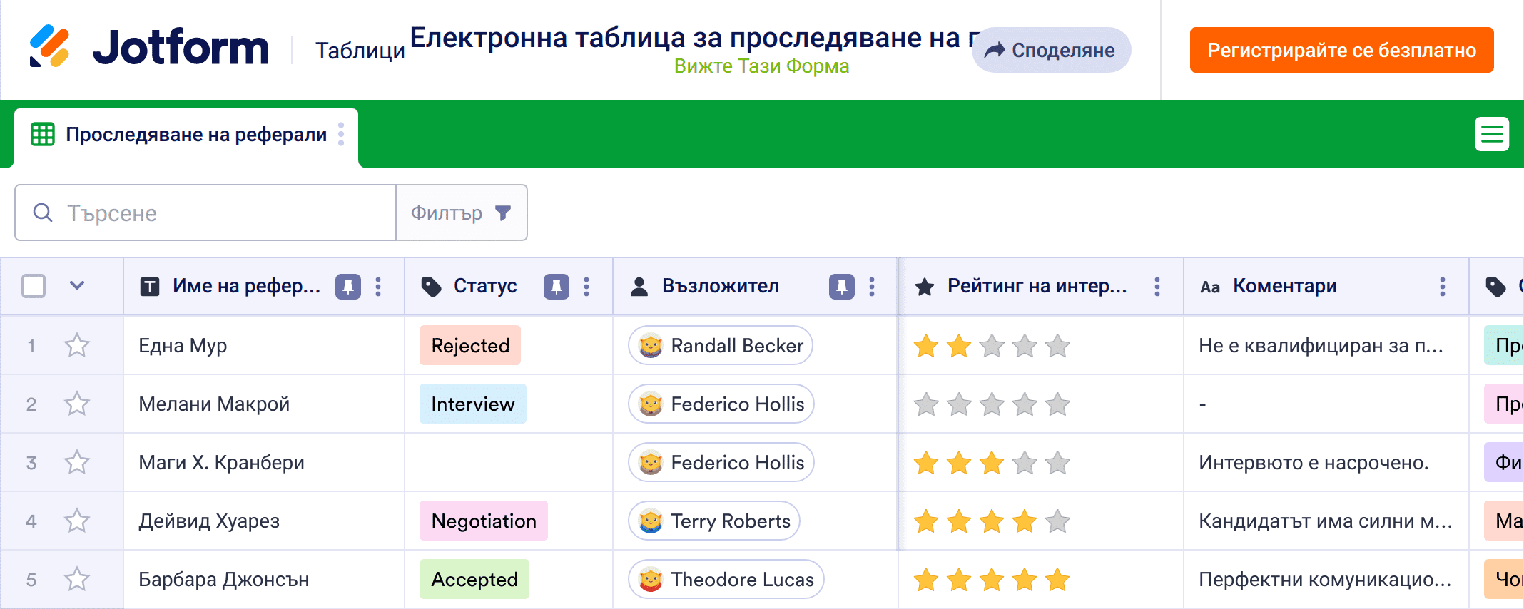 Получете външния вид и функцията, от която се нуждаете, като персонализирате тази електронна таблица за проследяване на препоръки, без да се изисква кодиране. Добавете нови колони, разделете информацията на отделни раздели, добавете въпроси към прикачената форма, персонализирайте цветно кодирани тагове и други. Информацията може да се разглежда като таблица, календар или като лесни за преглед карти, които ви помагат да преглеждате информацията за всеки кандидат поотделно. Издигнете вашия процеса на препоръчане на служители на следващото ниво с безплатната електронна таблица за проследяване на препоръки на Jotform.