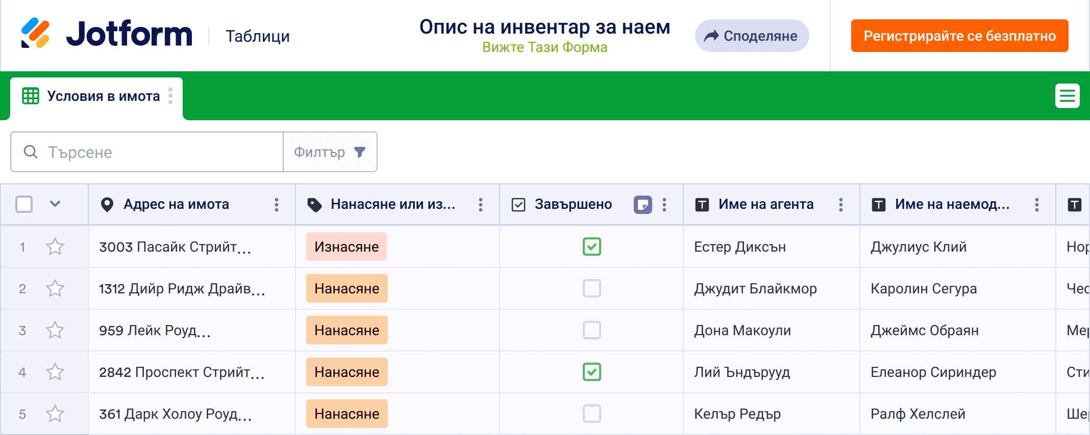 Чувствайте се свободни да персонализирате този шаблон за опис на инвентар за под наем и прикачената форма, за да отговарят напълно на вашите нужди. Добавете нови редове и колони, отделете информация в различни раздели, качвайте файлове във вашата таблица и други. Можете дори да създадете PDF документ за всяка проверка, лесен за изтегляне и отпечатване за вашите записи! Оптимизирайте вашите проверки за отдаване под наем с този безплатен опис на инвентар за обзавеждане за под наем — и гледайте как процеса върви по-гладко от всякога.