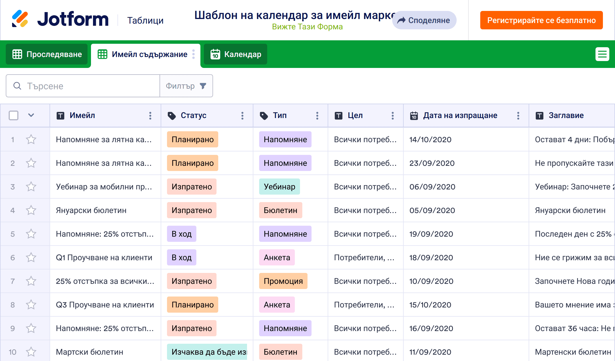 Календарът за имейл маркетинг се използва, за да помогне на фирмите да създават, планират, управляват и анализират кампании за имейл маркетинг като бюлетини, електронни книги и други. Организирайте, анализирайте и подобрете вашите кампании за имейл маркетинг с безплатен шаблон на календар за имейл маркетинг! Преглеждайте лесно честотата на отваряне и честотата на щракване, за да видите кои кампании са се представили добре и кои трябва да бъдат подобрени. Данните се съхраняват сигурно във вашия собствен Jotform акаунт и са лесно достъпни от всяко устройство.