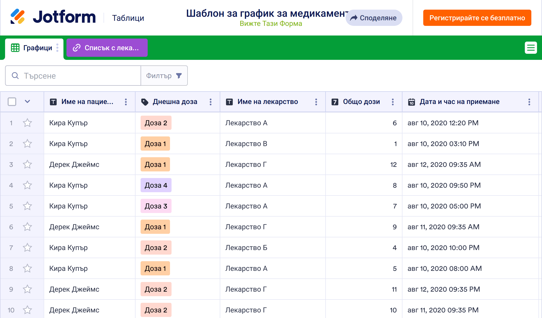 Независимо дали управлявате собствените си лекарства, следите лекарствата на пациентите си или се грижите за член на семейството, можете да управлявате вашите лекарства в професионална електронна таблица с безплатния шаблон за график за лекарства на JotForm. За да започнете, въведете важната информация, като име на всяко лекарство, честота на дозиране, странични ефекти, начална дата и други - след това влезте в Jotform на всяко устройство, за да достъпвате и лесно да управлявате информацията за лекарства онлайн, в електронна таблица или изглед на календар.