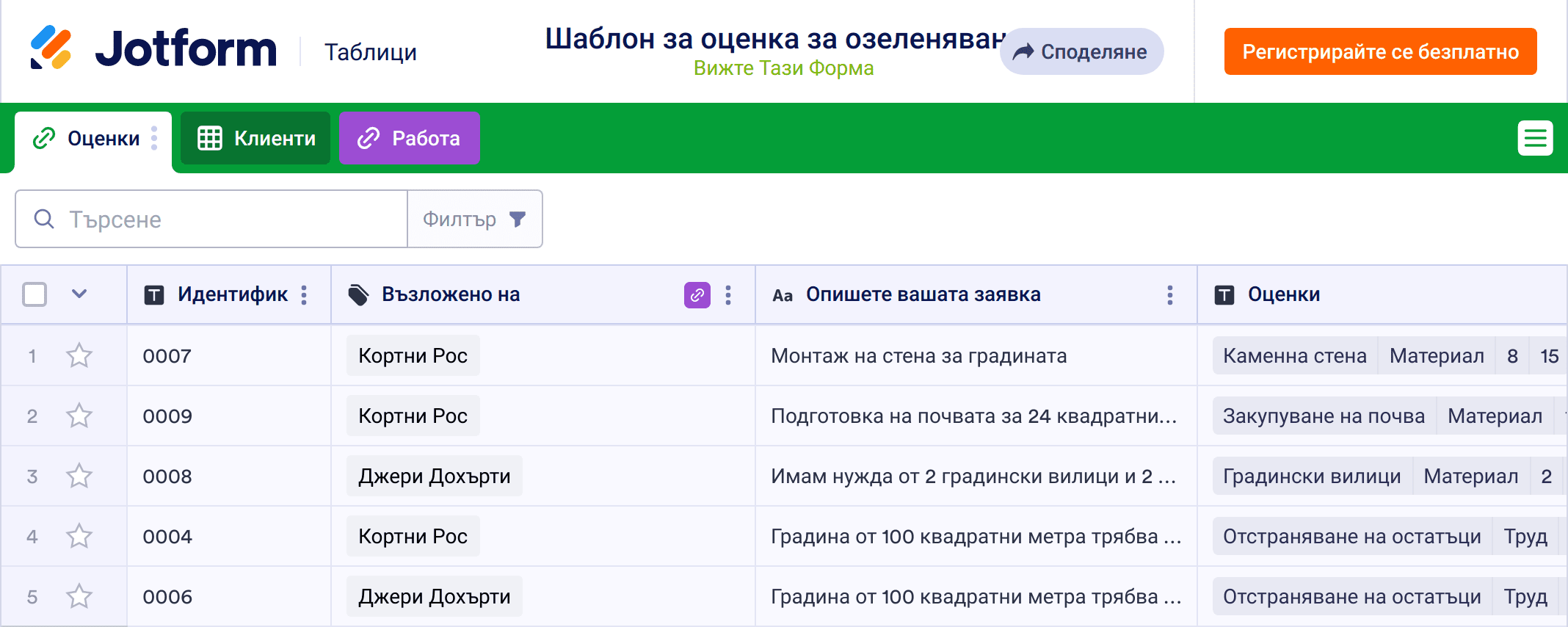 Шаблон за оценка за озеленяване се използва от озеленителите за детайлизиране на разходите, които са свързани с определени проекти за озеленяване. Независимо дали сте независим озеленител или управлявате бизнес за грижа за тревните площи, използвайте нашия безплатен шаблон за оценка на озеленяване, за да определите бързо и лесно прогнозите за разходи за всеки нов проект за озеленяване. Просто въведете детайли като работен идентификационен номер, описания на проекти, назначен озеленител, единична цена и необходими часове в предоставената електронна таблица. А с нашия конструктор на форми можете дори да синхронизирате тази таблица с форма за заявка за оценка, която моментално попълва електронната таблица с подадените данни.