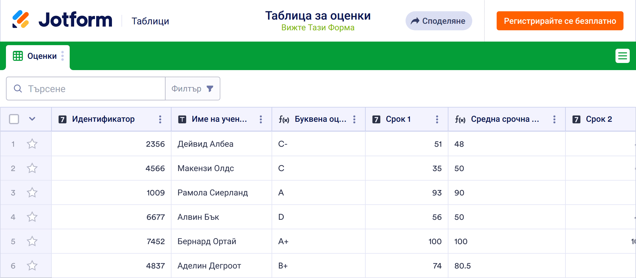 Подготовката и преподаването на уроци на учениците е достатъчно трудно, дори без да се налага да се притеснявате да следите оценките на учениците. Добре, че нашата безплатна онлайн таблица за оценки за учители от всички класове е лесна за използване и не изяжда вашето ценно време за преподаване. За да започнете, просто вмъкнете оценки за домашни задачи и тестове директно в електронната таблица - или попълнете приложената форма относно оценките на учениците и гледайте как резултатите моментално се появяват в таблицата с оценки!