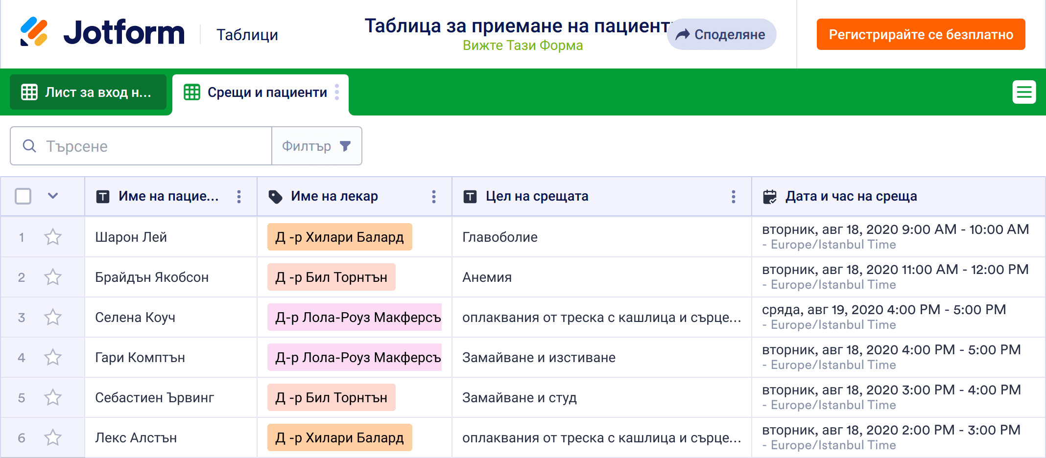 Подобрете посещението на пациента, като персонализирате ваша таблица за вход за пациенти само с няколко щраквания. Без да кодирате можете лесно да добавяте редове и колони, да създавате нови етикети и да правите нови раздели, за да видите срещите в изглед на календар. След като е готово за пускане, пациентите могат лесно да предоставят тяхното име, дата и час на пристигане, детайли за срещата и техния лекар, без да са необходими листове за вход на хартия. Следете входящите пациенти и техните срещи с онлайн лист за вход за пациенти, персонализиран за вашата медицинска организация!