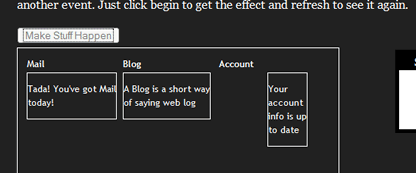 This is a combination of animation and custom events where Think Vitamin team show us how menu items sliding into view and firing off subscribable events using Yahoo! UI.One-time effect that shows off the menu opening up and firing an event.