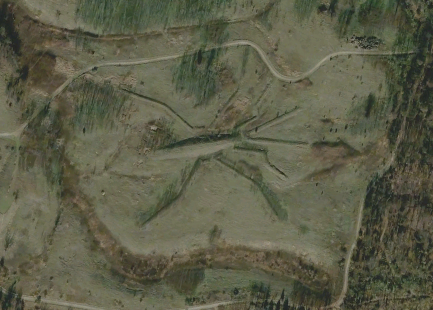 Effigy Tumuli, by Michael Heizer, are a few different land art pieces built on Buffalo Rock in Buffalo Rock State Park, overlooking the Illinois River. (Built between 1983-1985) The animal shapes are barely visible now from satellite pics, though you can see the beetle or roach shape outline in this screengrab.