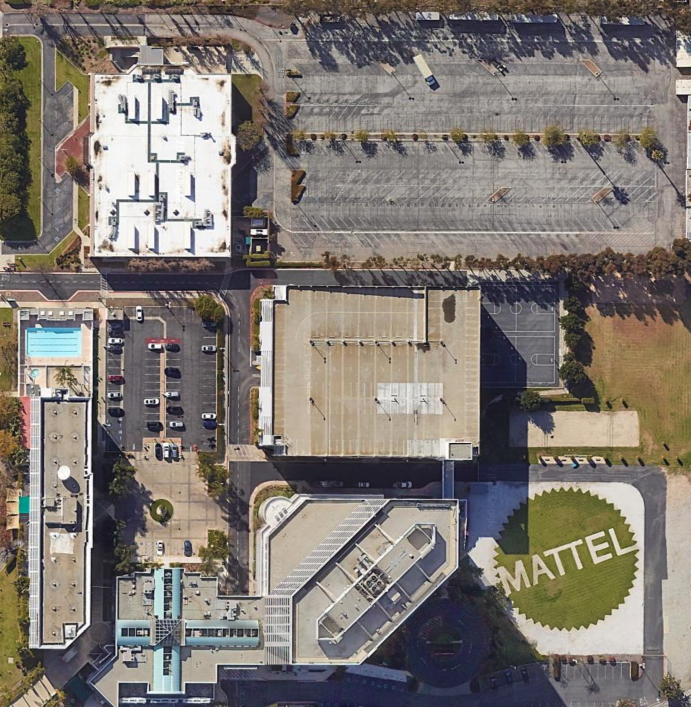 The giant logo of Mattel is visible at their headquarters in El Segundo, California.