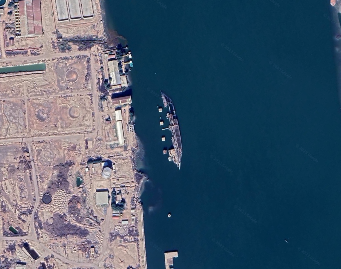In the waters of Basrah in Iraq, a ship is afloat in a sideways position.