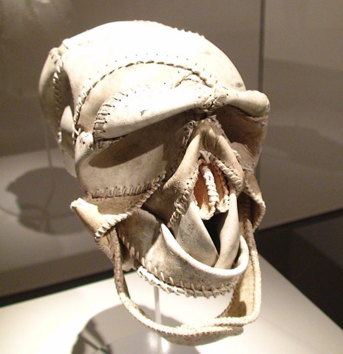This skull was crafted from old baseball coverings.