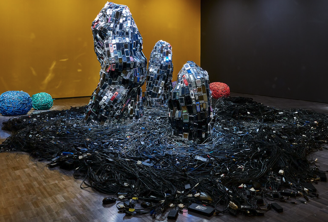 “Huddled Masses” by Jean Shin is a captivating, technology-driven exhibition that intertwines e-waste and miles of computer cables, inviting reflection on the environmental impact of technology, planned obsolescence, and our digital footprint in the Anthropocene age.