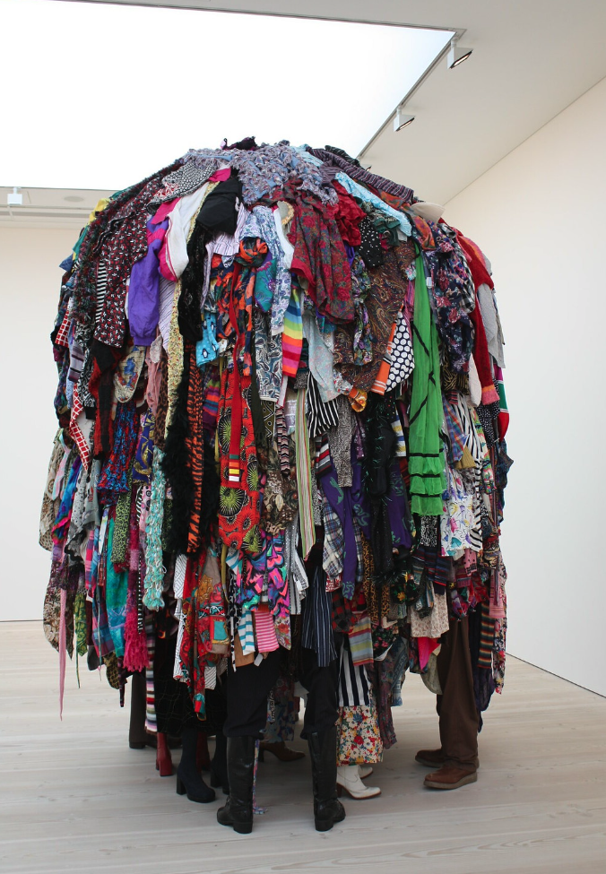 This is a lot of clothing. Guerra de la Paz repurposes clothes and shoes and turns them into an artwork.
