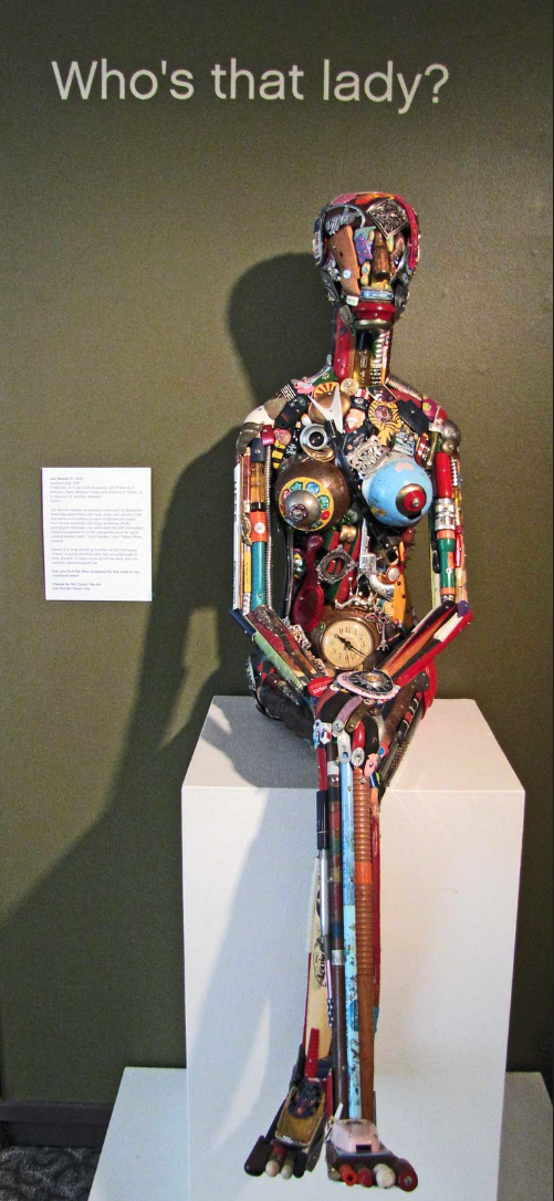 The artist obviously has a great understanding of the human form. Notice the old typewriter pieces on the lower abdomen.