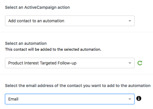 All you need to do is select a specific field in your form where an email address will be entered and an ActiveCampaign automation where all transferred email addresses from your form will be sent.