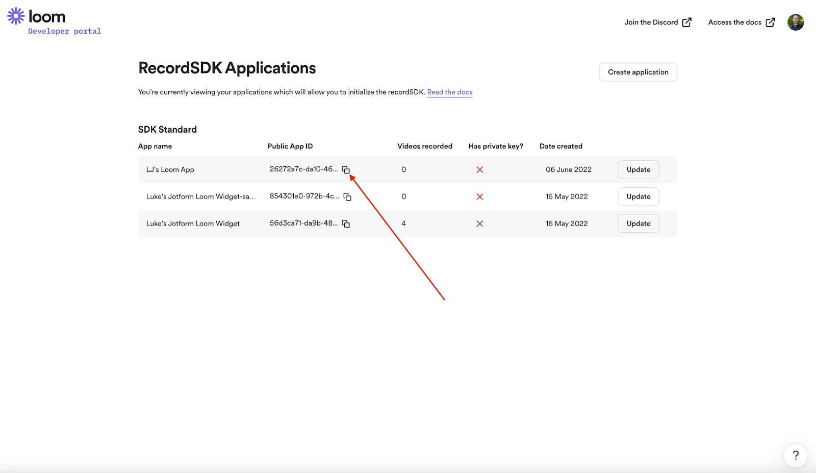 To obtain your Public App ID, go to the Loom Developer page and click the Create application button.