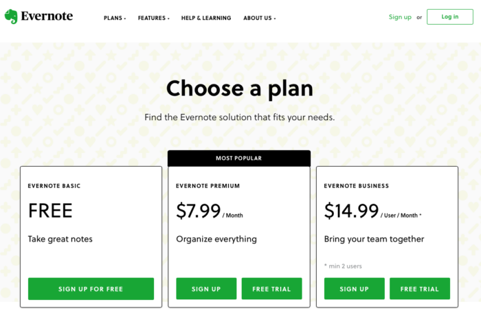 Similar to Asana, Evernote offers a free plan that’s ideal for individuals looking for more basic capabilities. Evernote’s three pricing tiers are Personal ($10.83 per month), Professional ($14.17 per month), and Teams ($20.83 per month).