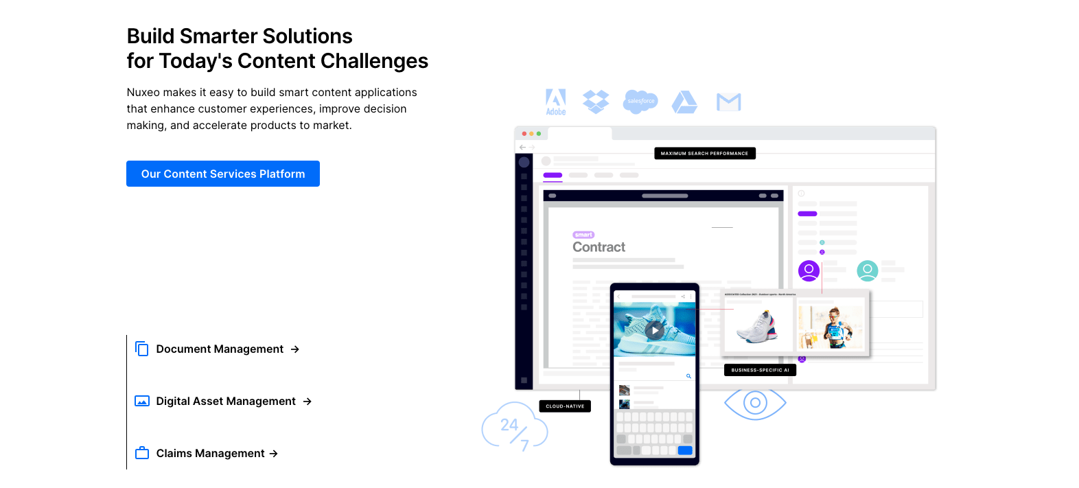 Nuxeo is a low-code platform that scales to meet the growing needs of your business. Leaders in the finance, insurance, and technology industries use it to streamline their workflows. From creating and managing documents to automating standard operating procedures and ensuring compliance, Nuxeo has your enterprise covered.