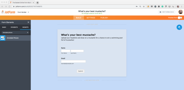 After building your form, head over to the Widgets section (located on the left-hand side of the Form Builder) and search for Annotate Picture.
