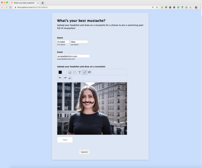 If you decide to go with the latter, form respondents can upload and mark up their own image like I did above. (Check out that mustache handiwork 😏).