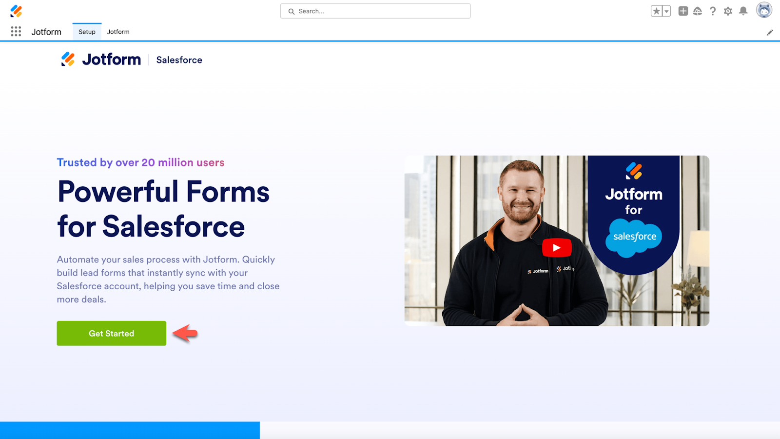 Once you’ve downloaded Jotform from the AppExchange, sign into your Jotform account with the Get Started button.