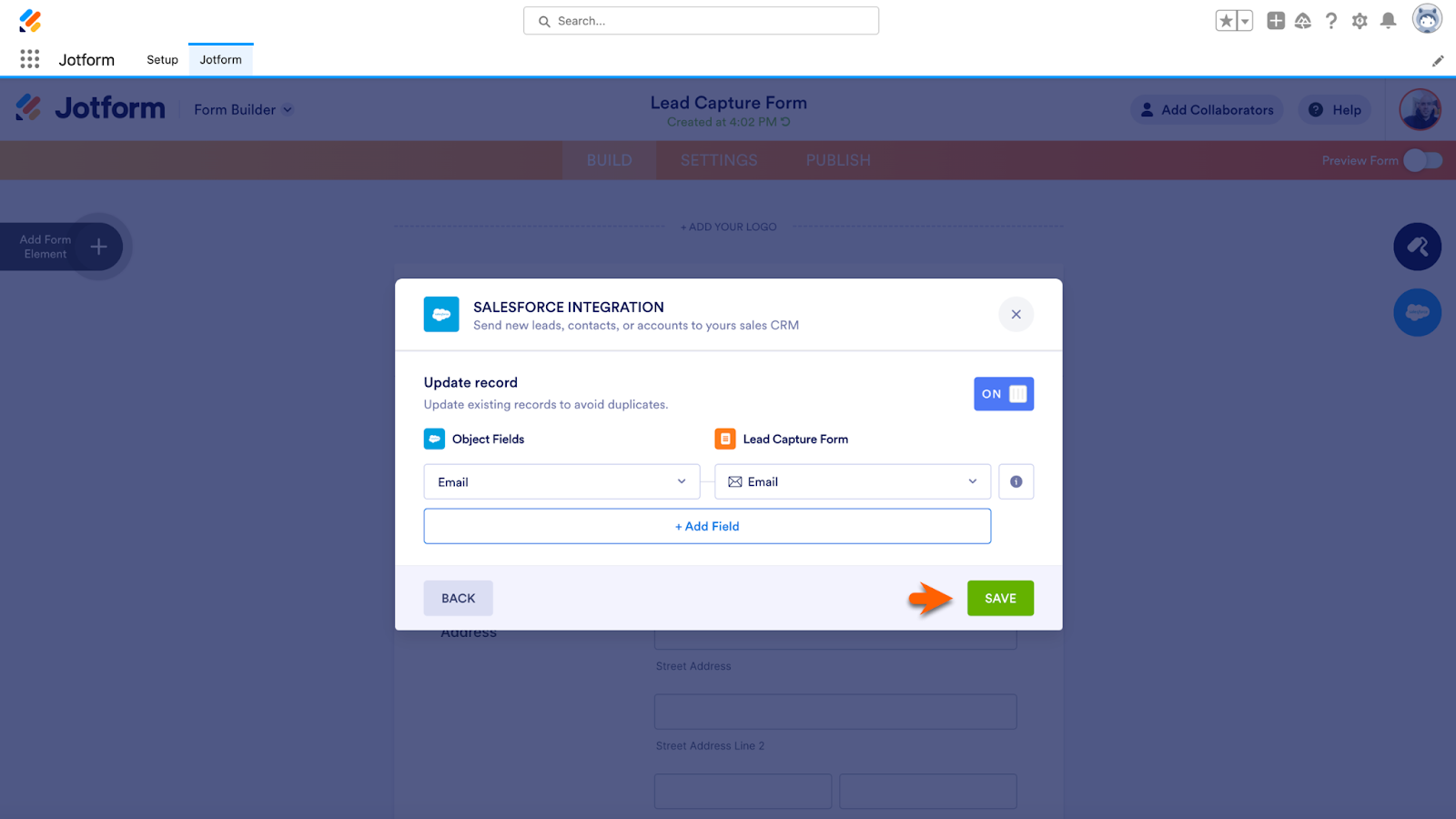 The final settings menu provides a way to update a record. This will ensure there’s no duplicate data in your Salesforce object. Switch on the Update record toggle button to reveal object fields and form fields from your template, similar to the previous menu. Choose which fields you’d like to update if duplicate data is found in Salesforce. Click Save, and your form will be ready to distribute.