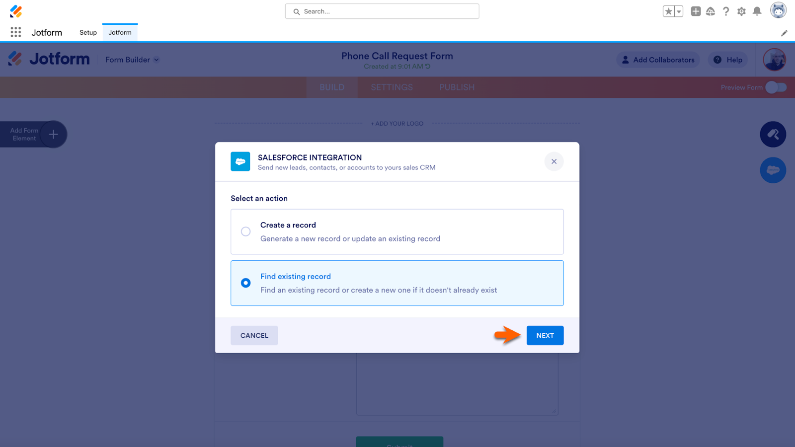 To use the Find existing record option, select your preferred Salesforce form template, just as we did before. This time, click Find existing record from the Salesforce Integration popup menu. When you’re ready to proceed, click Next.