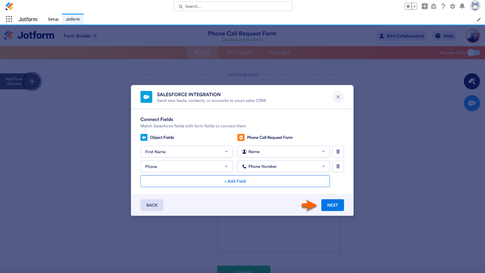 When the next popup menu appears, choose which Salesforce object you’d like to send Jotform submission data to and click Next.