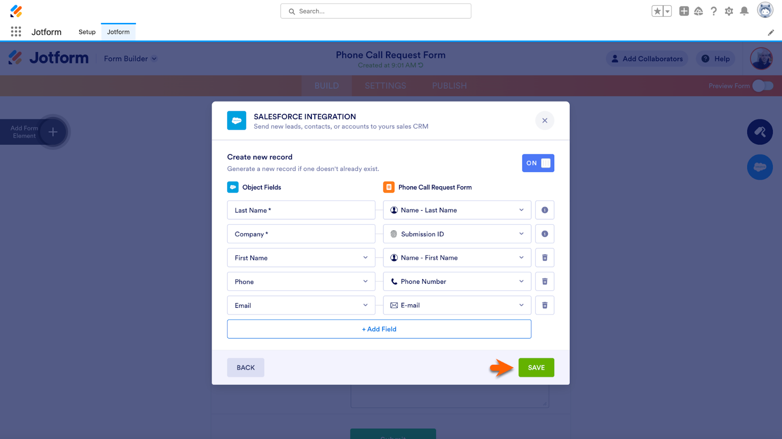 In this case, the final popup menu provides a way to generate a new record if an existing record isn’t found. To activate this feature, move the Create new record toggle button to the on position and match your form elements and object fields. Click Save, and your form will be ready to distribute.