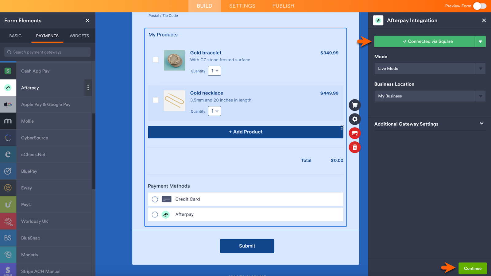 Once Square and your form are connected, use the Payment Methods section to choose from five popular payment options. In the example below, Afterpay is selected, along with the credit card option, which is selected by default. After selecting the preferred payment methods, click the Continue button to finish setting up the integration.