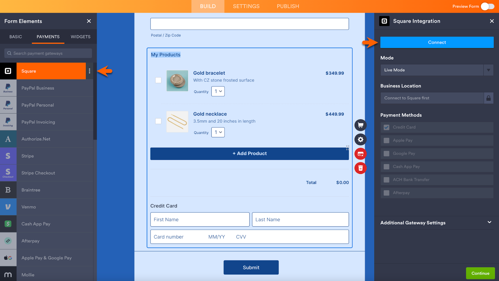 To add Afterpay and more to your form via Square, go to the Payments section of the Form Elements menu in the Form Builder. Click on the Square integration to open the integration menu. Click the blue Connect button to log into your Square account or create a new one.