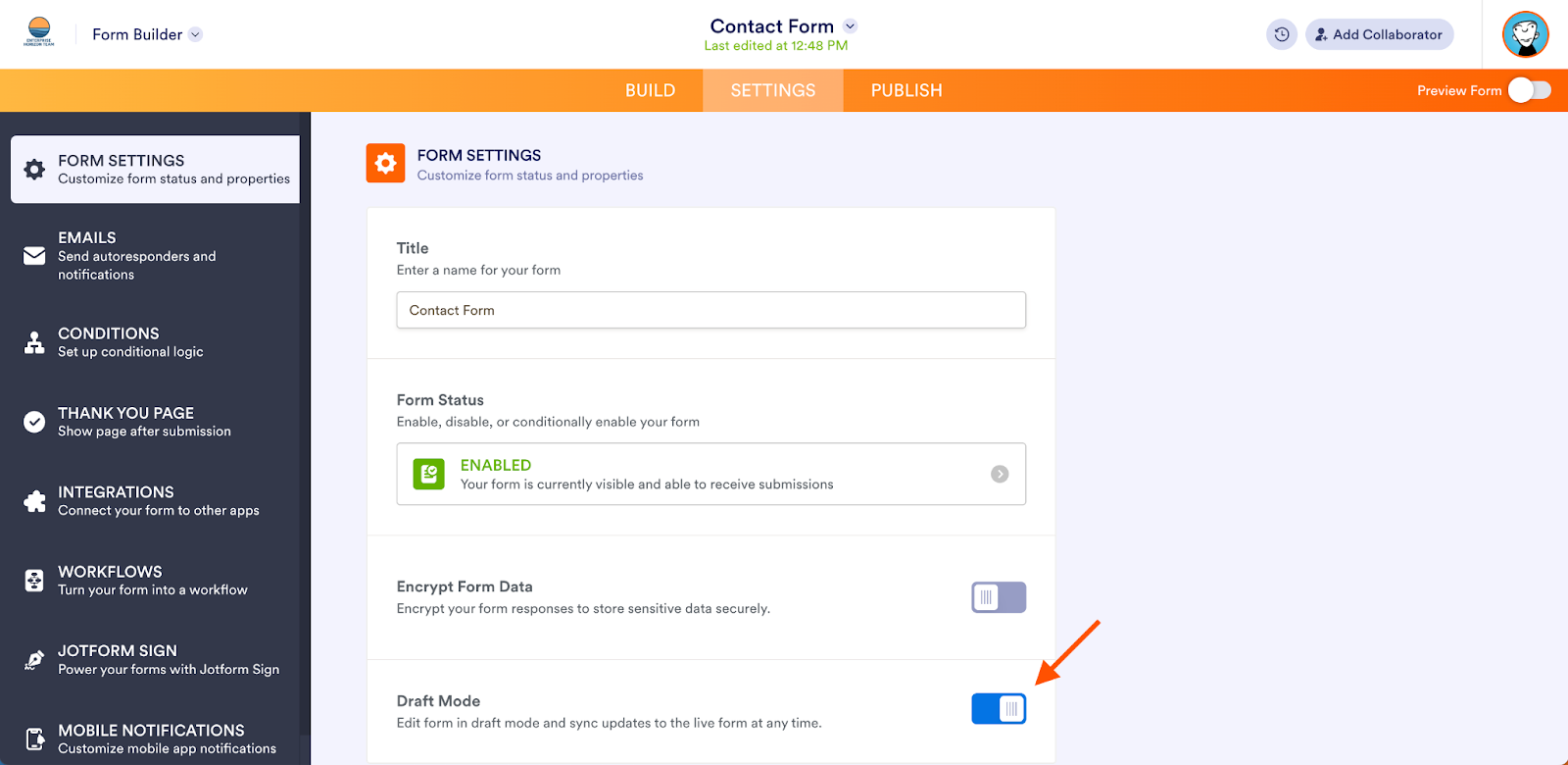 With this new feature, every Jotform Enterprise form now allows you to draft and publish on your own terms. By enabling Draft Mode in your form settings, you can turn your form editor into a draft environment where form changes won’t go live until you choose to sync them.