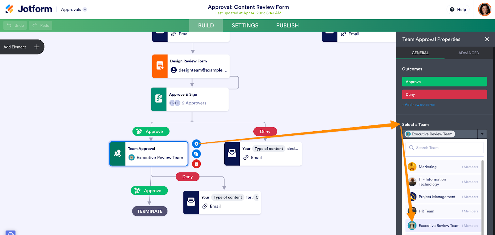 To add a team to your approval workflow, click the Team Approval element in the menu on the left and drag it into your approval workflow.