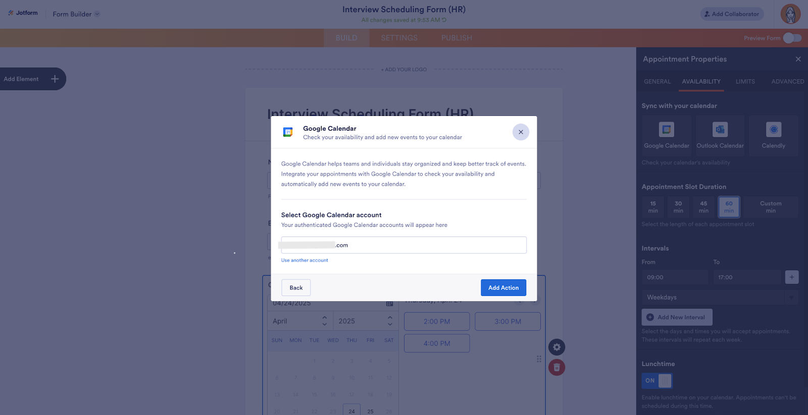 Once you’ve connected Jotform with your Calendly account, click the Add Action button to access your appointment settings.