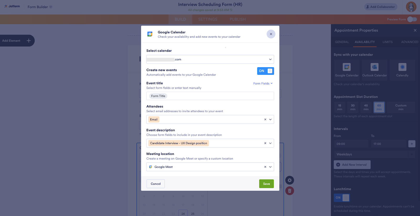 Finally, you can add a meeting location. You can pull the options from a meeting location field in your form, choose Google Meet, or set another custom option, like an alternate video conferencing tool. Click Save when you’re finished.