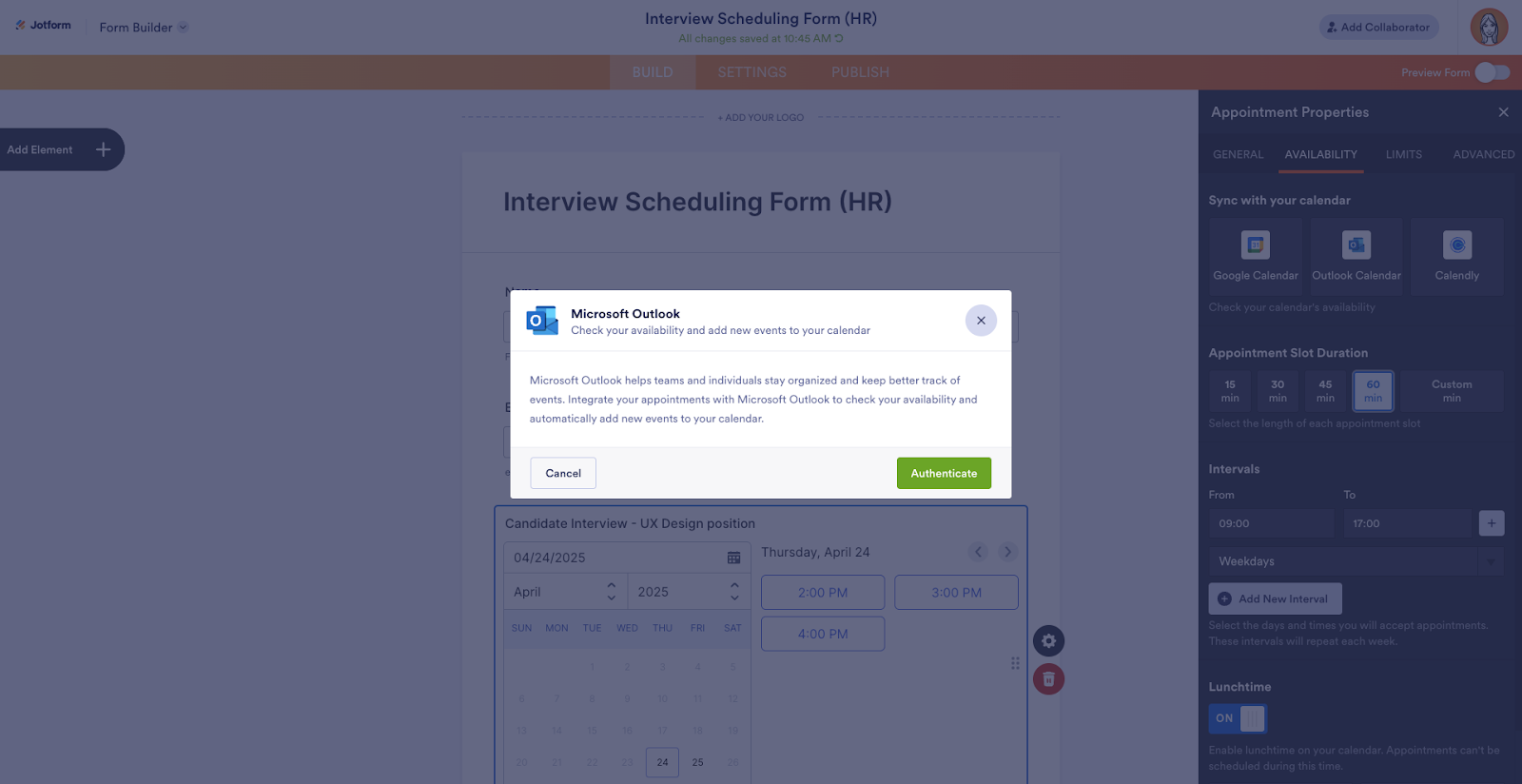 - HR teams rely heavily on their calendars to manage everything from candidate interviews to important internal meetings. Let’s say an HR team uses Jotform Enterprise to schedule interviews with job applicants and Outlook Calendar to manage appointments companywide. With Jotform Appointments, the appointment field in Jotform syncs with their Outlook Calendar, so that booked time slots are hidden in the form. When a candidate selects an interview time and submits the form, a new meeting is automatically created in the HR representative’s Outlook Calendar.