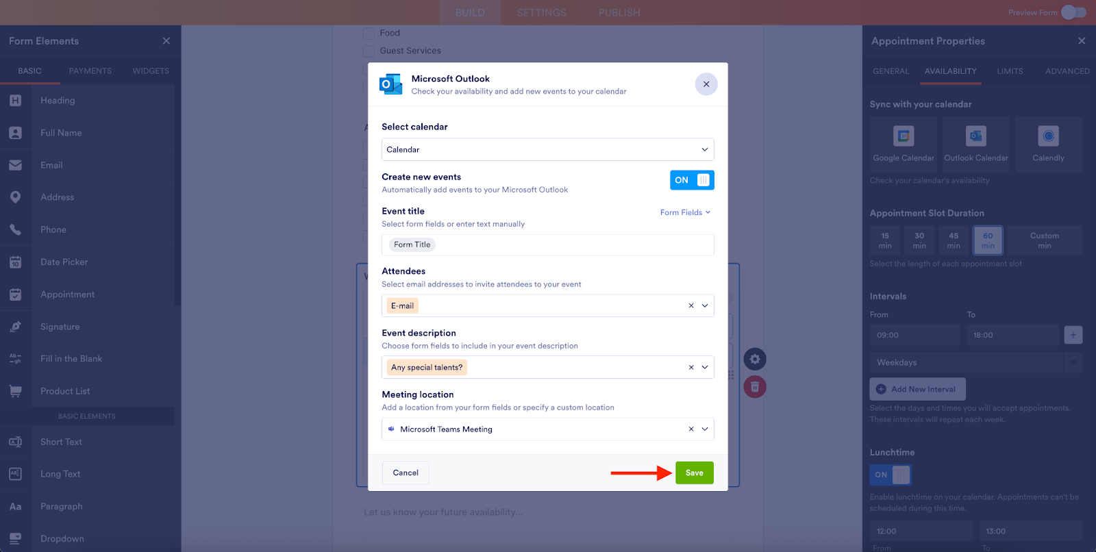 In this example, I’ve selected the calendar I’d like to connect to in Outlook and set the calendar event title to match the appointment form title. I’ve also changed the event description to include comments. My custom meeting location will be Microsoft Meet.