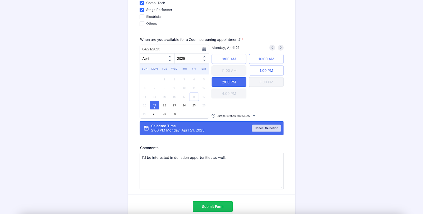 When someone tries to schedule an appointment on April 21st, the form shows them only available 60-minute windows (during the hours I’m available for appointments). Any time slot that is already booked with a meeting in my Outlook Calendar is grayed out.