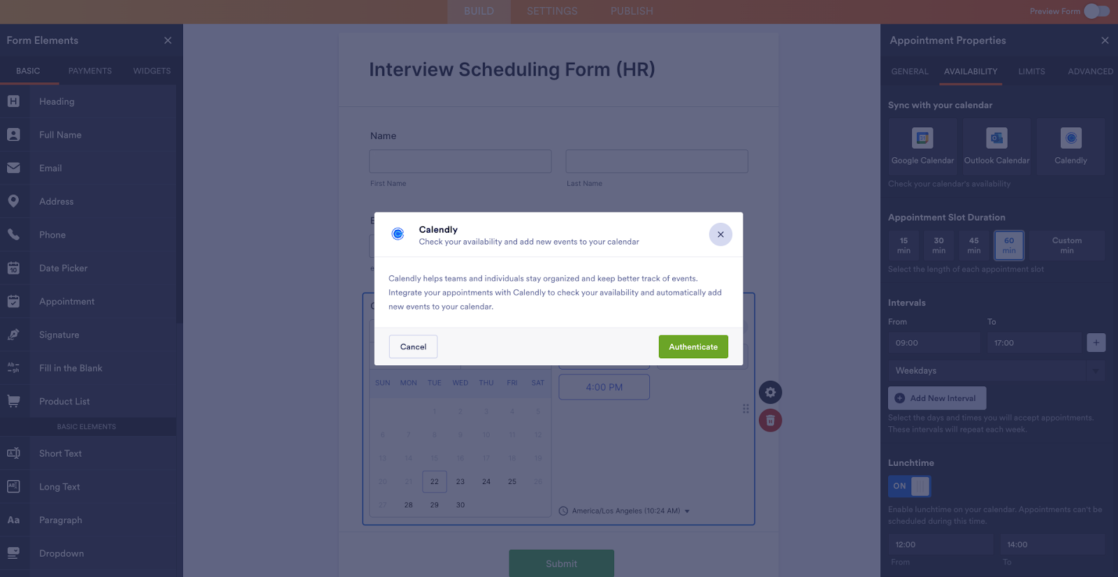 In the Form Builder, drag and drop the Appointment field into your form from the Form Elements menu on the left. When you click the gear icon next to the field, the calendar sync options appear on the right.