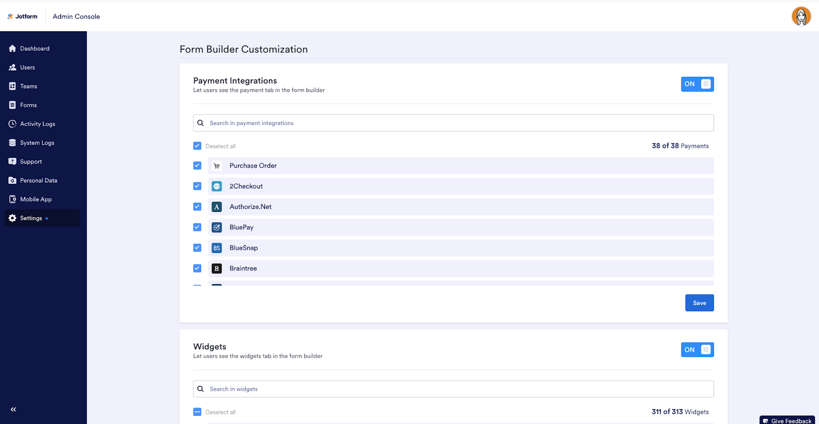 Once the payment integrations are enabled in the Admin Console, you can select which payment platforms to offer.
