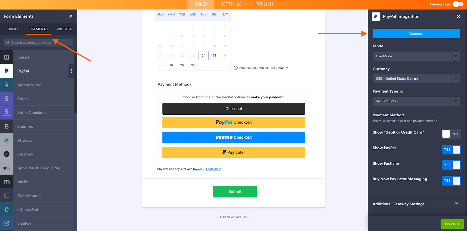 Then, you’ll be able to add a payment widget directly to your appointment form. In the Build tab of the Form Builder, select +Add Element on the left. Then click the Payments tab. Drag and drop the payment integration you want to use into your form. Follow the prompts to connect the integration and customize it to your needs.