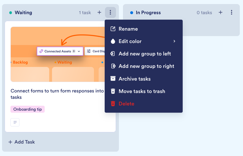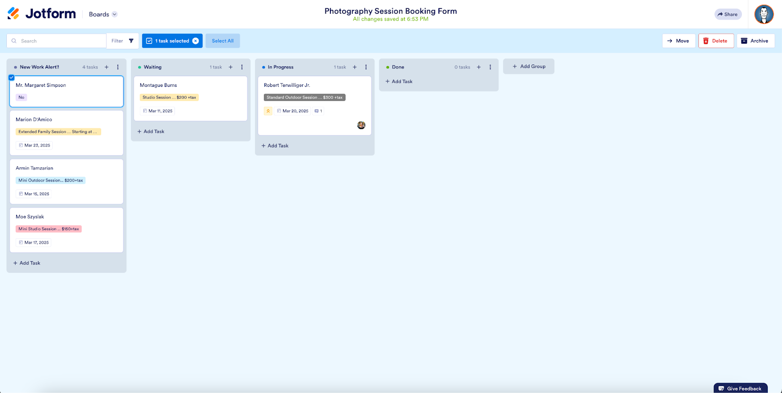 Once you’ve connected your form to a board, any existing submissions will appear in the first task group. Now you can begin to use the board’s drag-and-drop functionality to create and manage tasks!