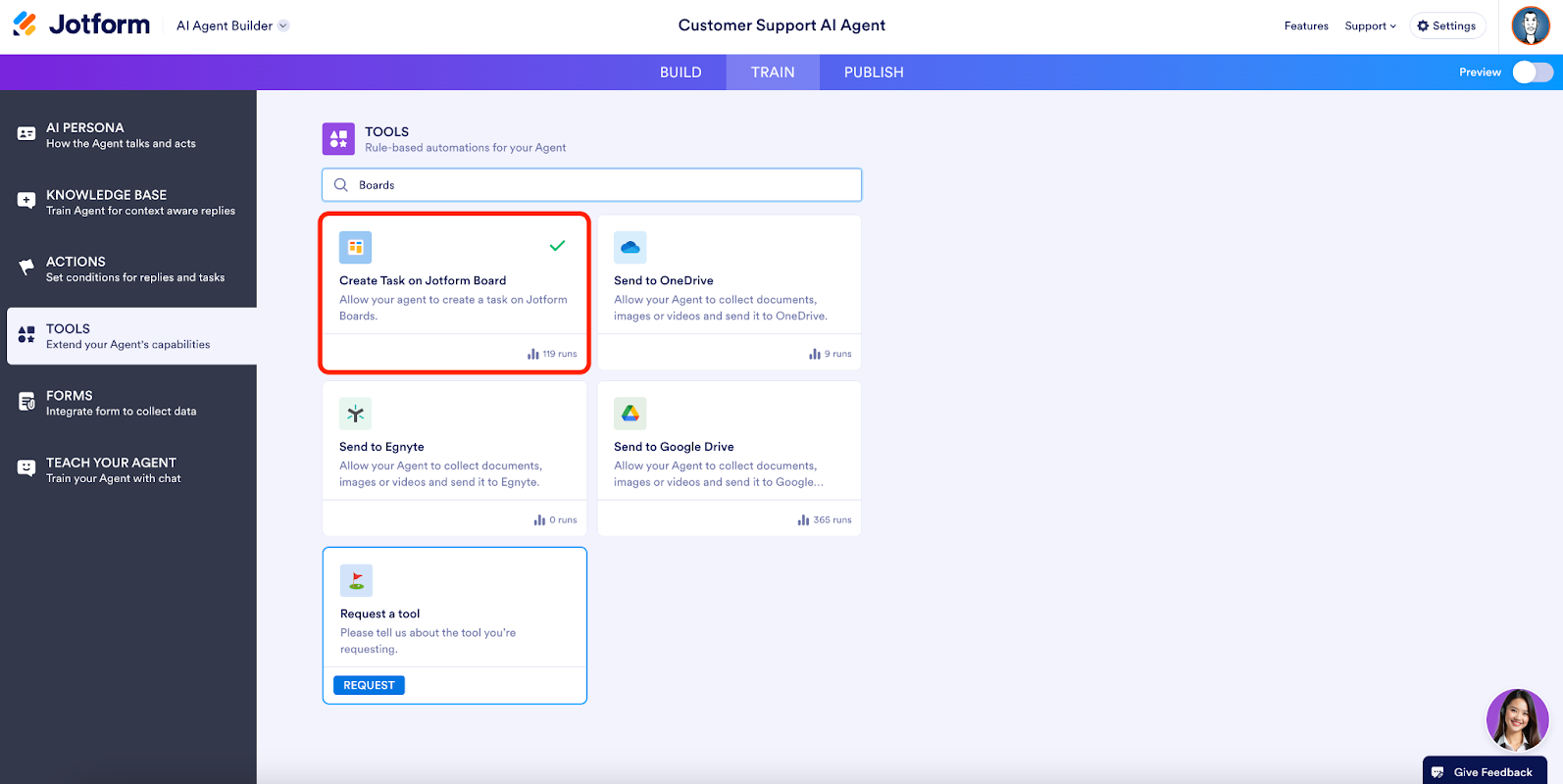 To get started, in the AI Agent Builder, select Train from the toolbar, then in the sidebar of the Train page, select Tools. In the search bar, enter “boards.” Select Create Task on Jotform Board.