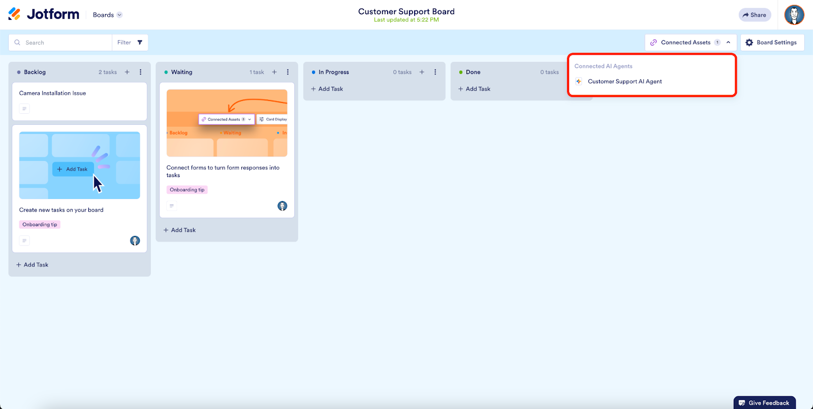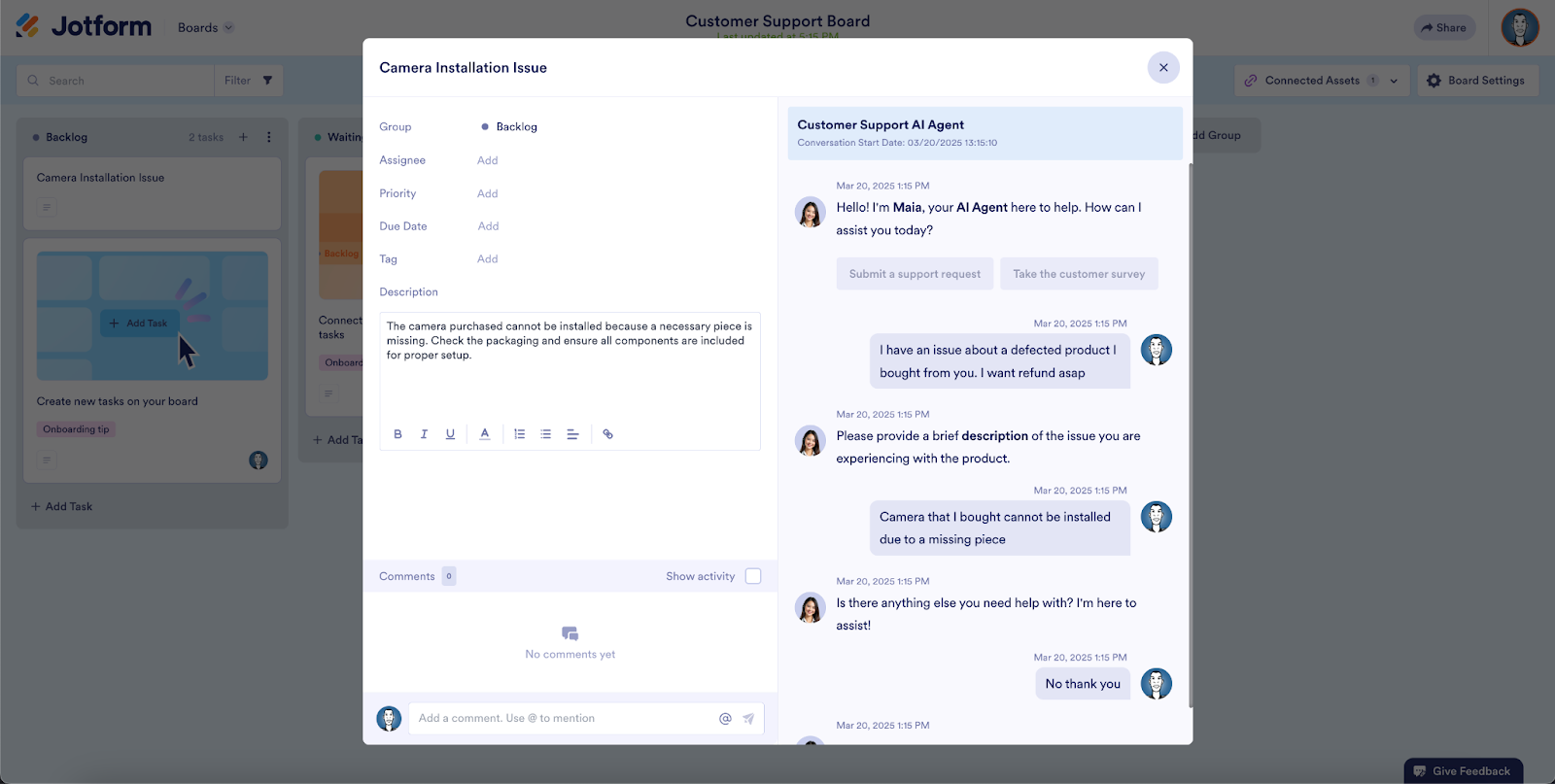 That means that if your customers give feedback, ask for more information, place orders, or make other requests through your AI Agents, Jotform can automatically turn those requests into tasks that hit your board.