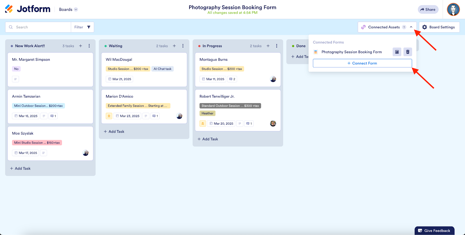 Another amazing feature of Jotform Boards is that you can link multiple forms and channels to a single board! If you want to add more forms to your board, just select Connected Assets once again and add them.
