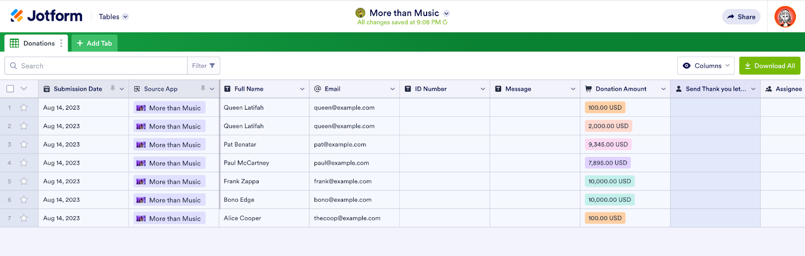 Use Jotform Enterprise Tables to manage donations, build custom reports to track donors, assign follow-up tasks to others, measure outreach, and communicate campaign success. You can also view donation submission data in Inbox.