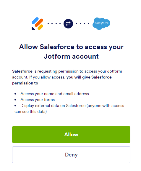 This will take you to the Jotform Enterprise login page. From here, use your Enterprise subdomain and login to access your Jotform Enterprise account. After logging in, you’ll need to allow Salesforce to access your Jotform Enterprise account.