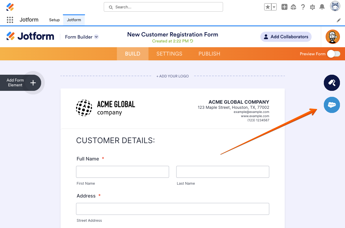 To integrate with an existing form, open the Jotform app within Salesforce and go to the form you want to use. In the form builder, click on the blue Salesforce button on the right side of the screen.