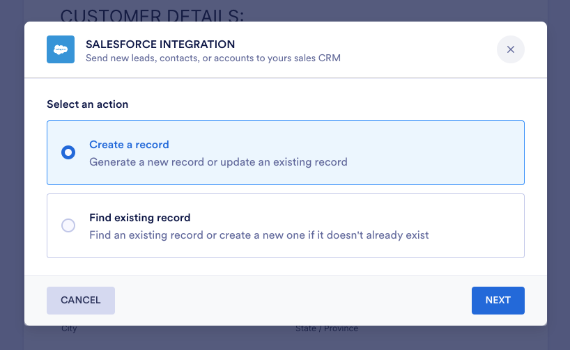 Next, you’ll be prompted to select an action. You can choose either Create a record or Find existing record.