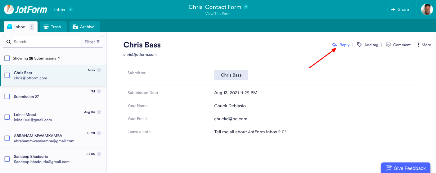 You must include the email form element in your online form to contact someone about their submitted responses through Jotform Inbox.