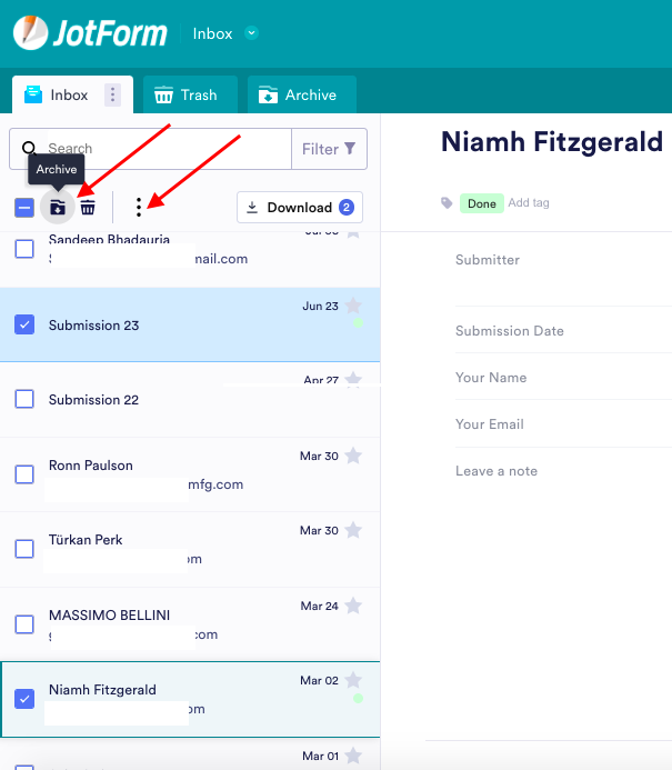 Working in tandem with search, you can employ filters to parse and arrange a set of your submissions based on categorization and form fields (i.e., name, email, submission details, tags).