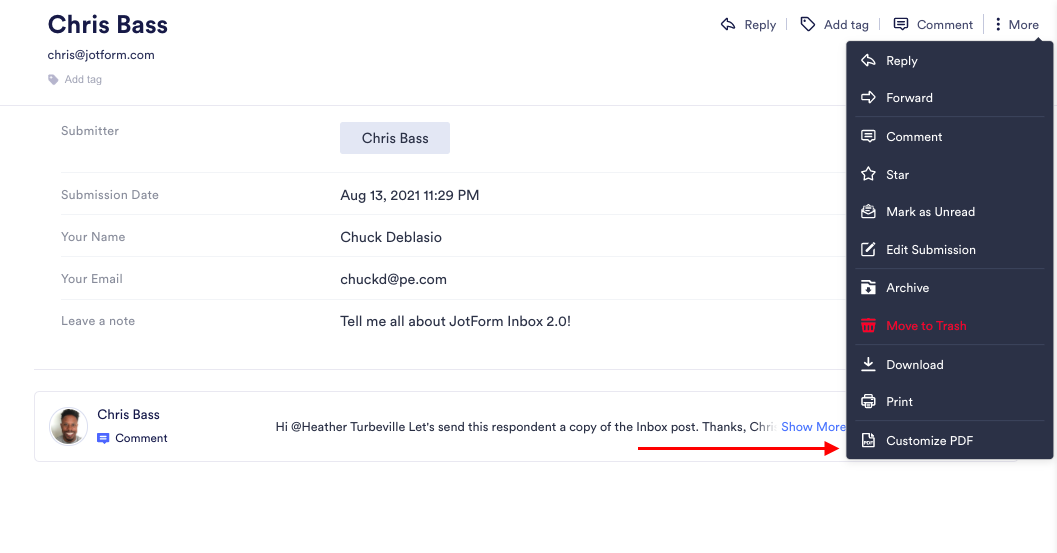 We mentioned earlier that Inbox allows you to use Jotform’s PDF Editor to edit and convert submissions. This creates a one-stop shop for updating documents you need to pass along to collaborators. Doing so within Jotform eliminates the data security concerns that might otherwise accompany downloading customer data and sending it through a third-party email provider.