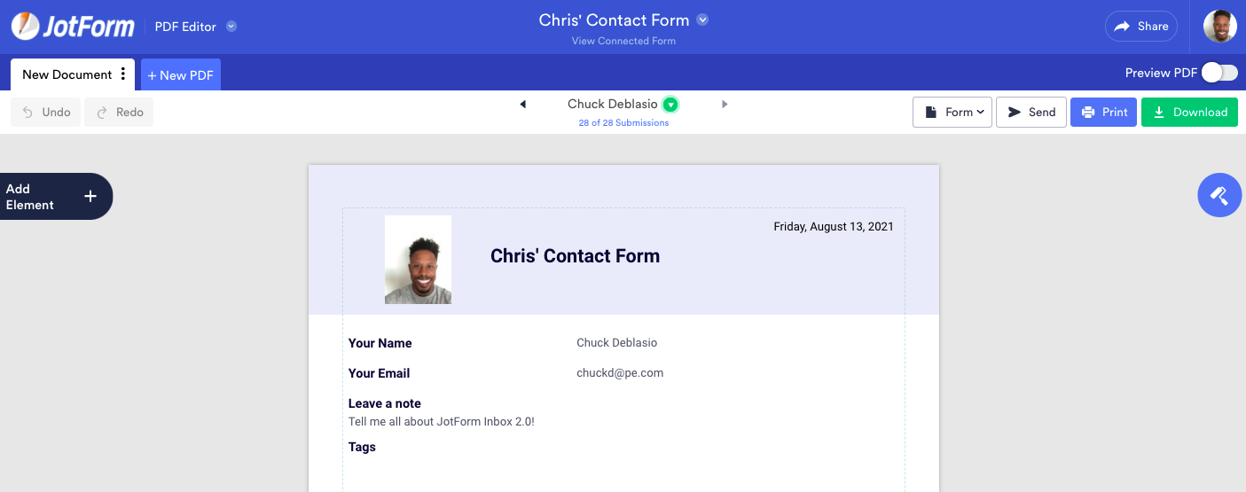 You can download and save a submission as a PDF, print it out in one click, or customize the submission as a PDF in Jotform’s PDF Editor.